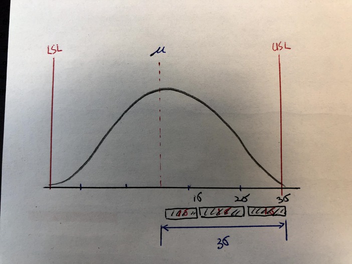 CP는 측정 데이터의 중심이 USL 과 LSL의 중심에 있다는 가정에서 구하는 수치입니다. 아래의 그림을 한번 보면 이해에 도움이 될것같습니다.