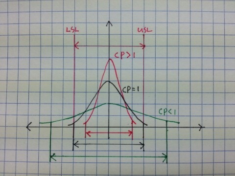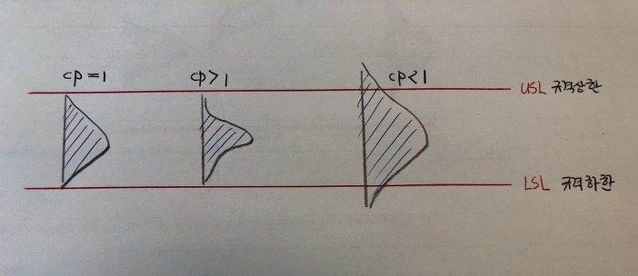 - 표준편차 (그 흩어짐 정도)가 작어서 규격안에 (6 * 표준편차) 보다 많이 들어간다면 CP 는 1보다 큰 값을 갖게 되고,