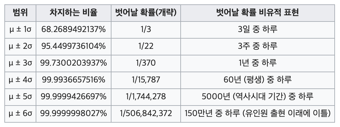 - 거의 모든 값들(실제로는 99.7%)이 평균에서 양쪽으로 3표준편차 범위(μ±3σ)에 존재한다.