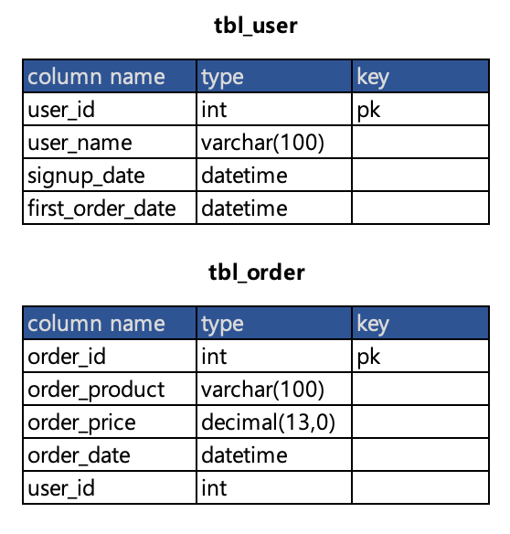 1. 아래와 같이 tbl_uesr, tbl_order 라는 테이블이 있다고 가정합니다.