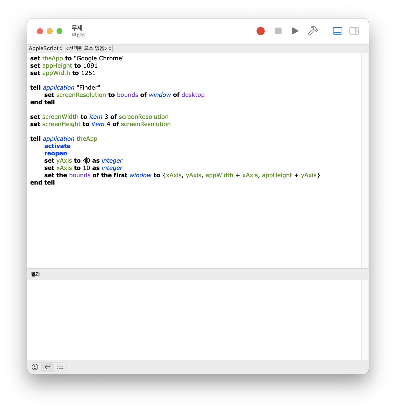 아래 그림처럼 "스크립트 편집기" (Script Editor) 를 열어서 아래와 같이 스크립트를 적어준다.