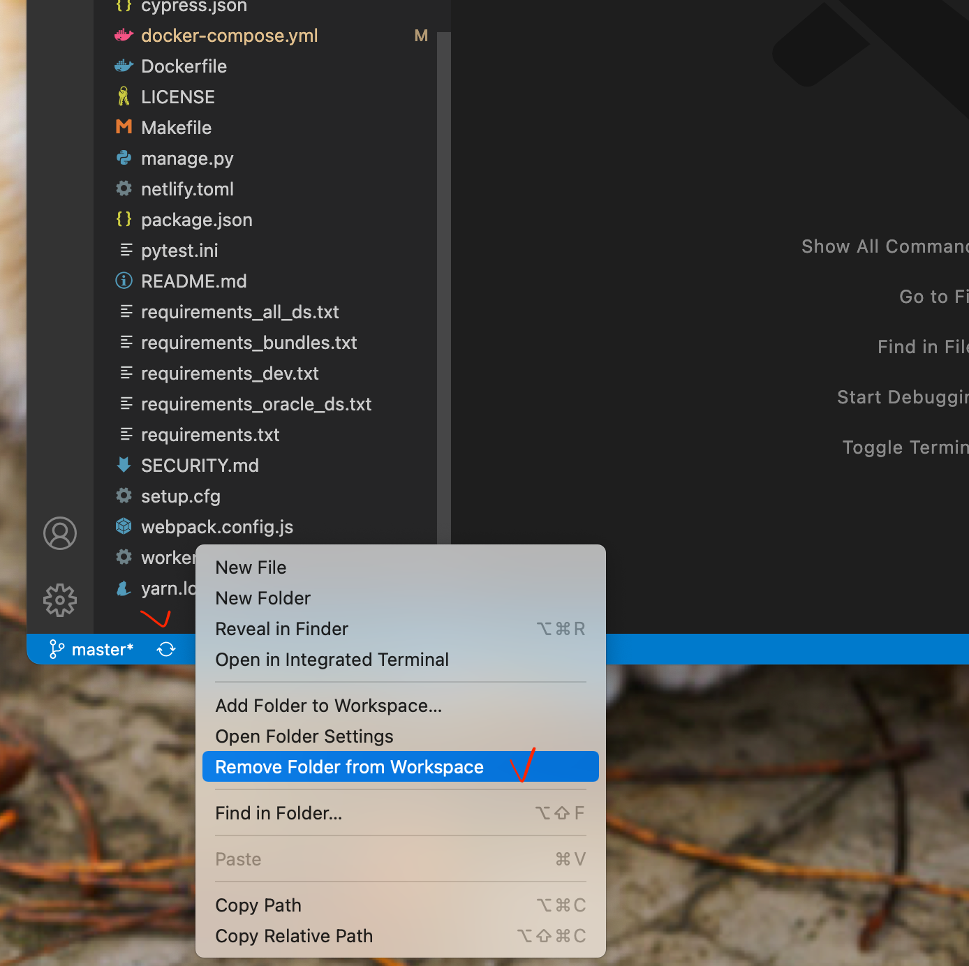 워크스페이스에서 폴더를 지우는 메뉴를 볼 수 있다.