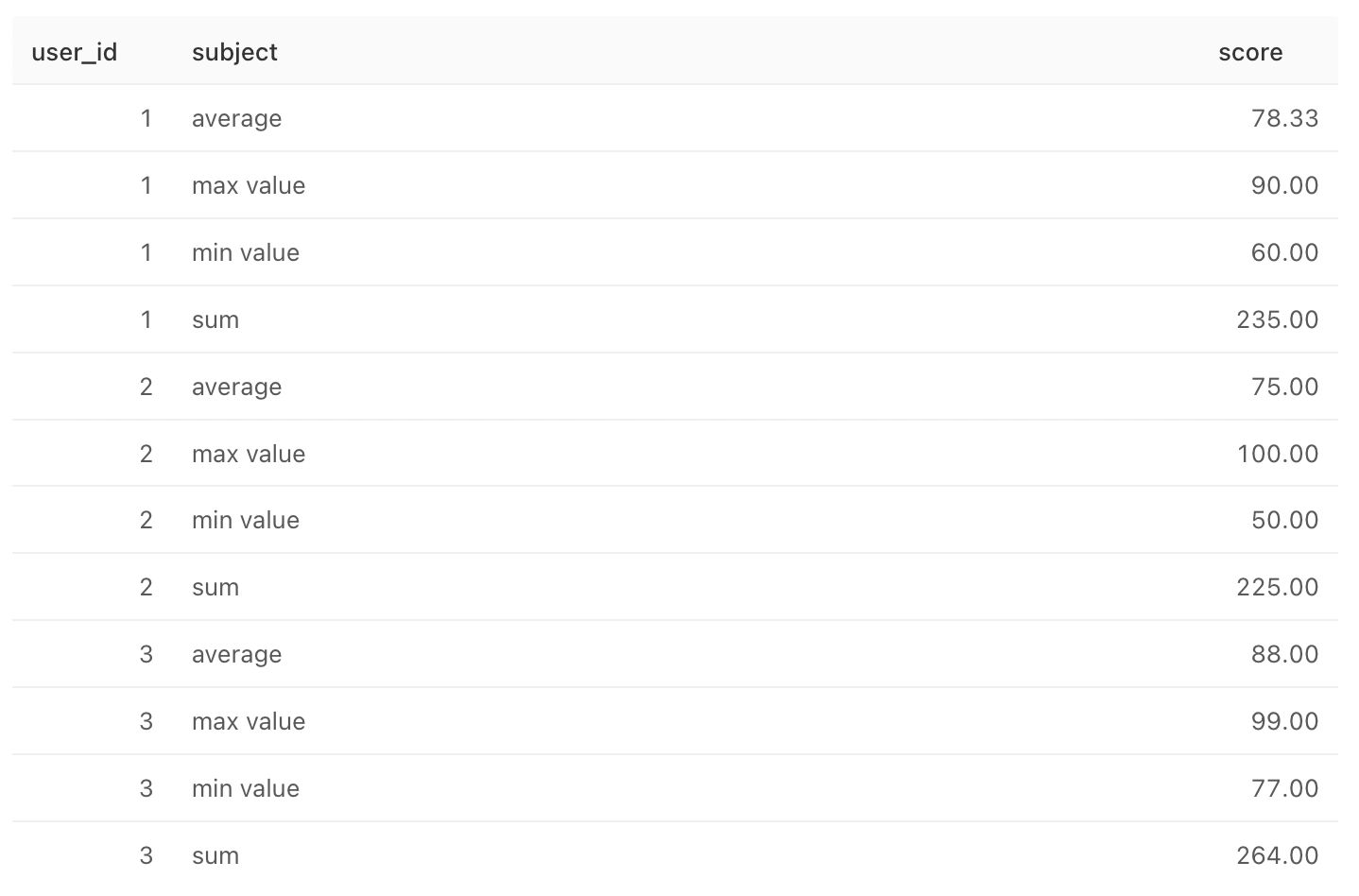 list (user_id, subject, score) as ( values