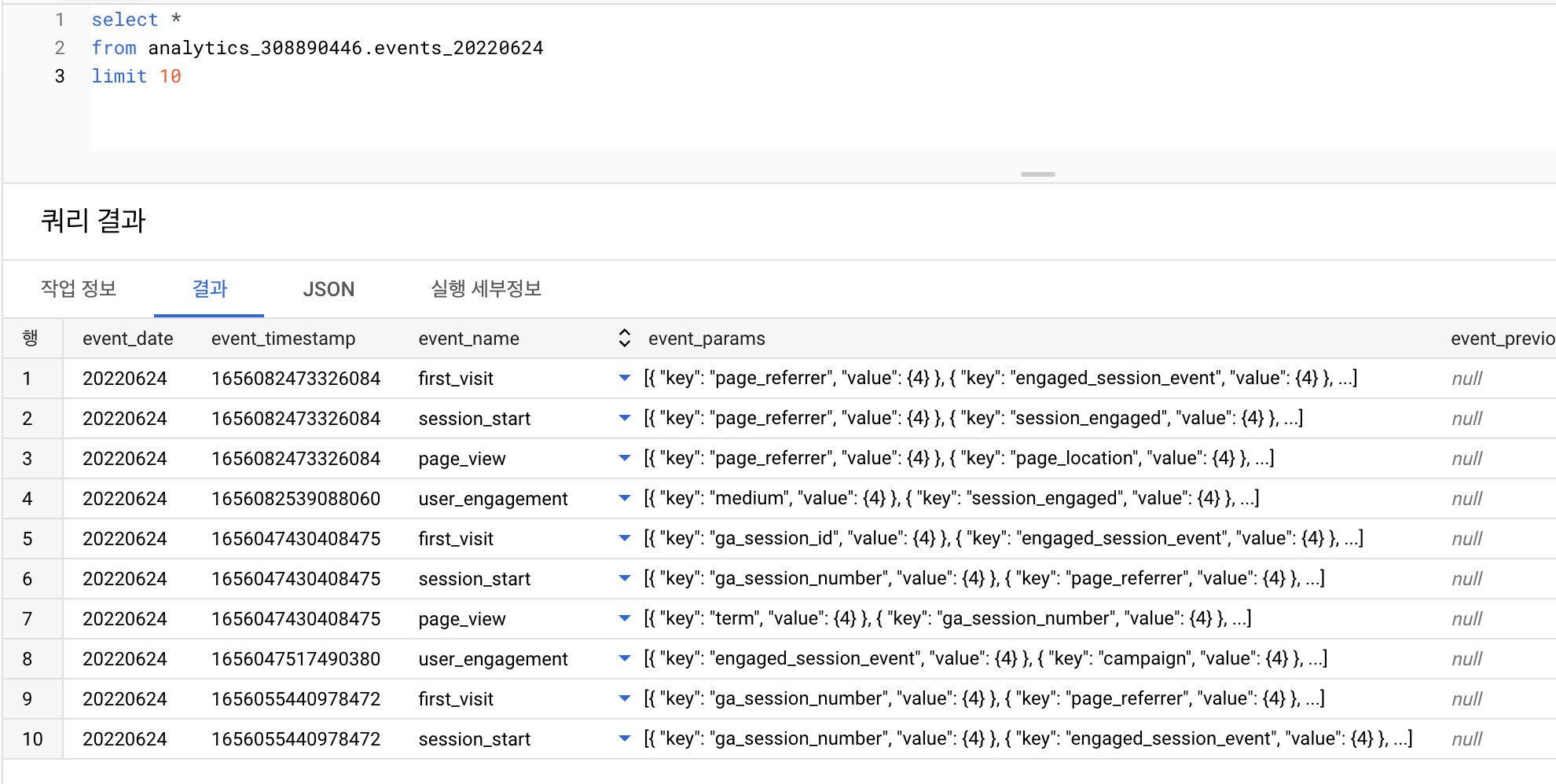 GA4 를 Bigquery 와 연결하고 데이터를 살펴보면 다음과 같다.