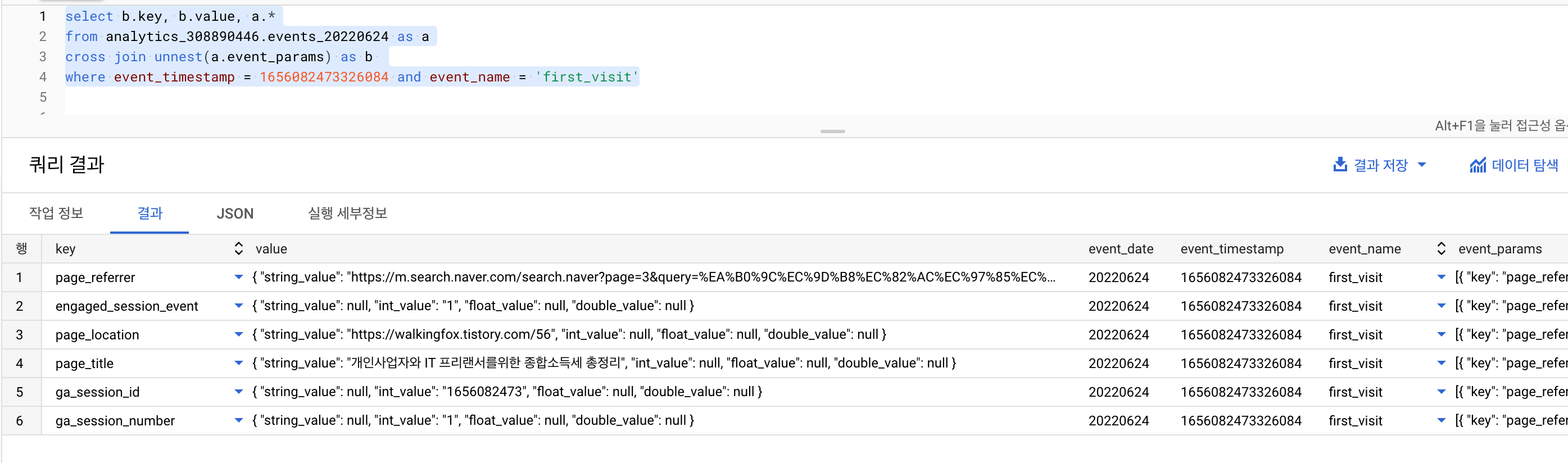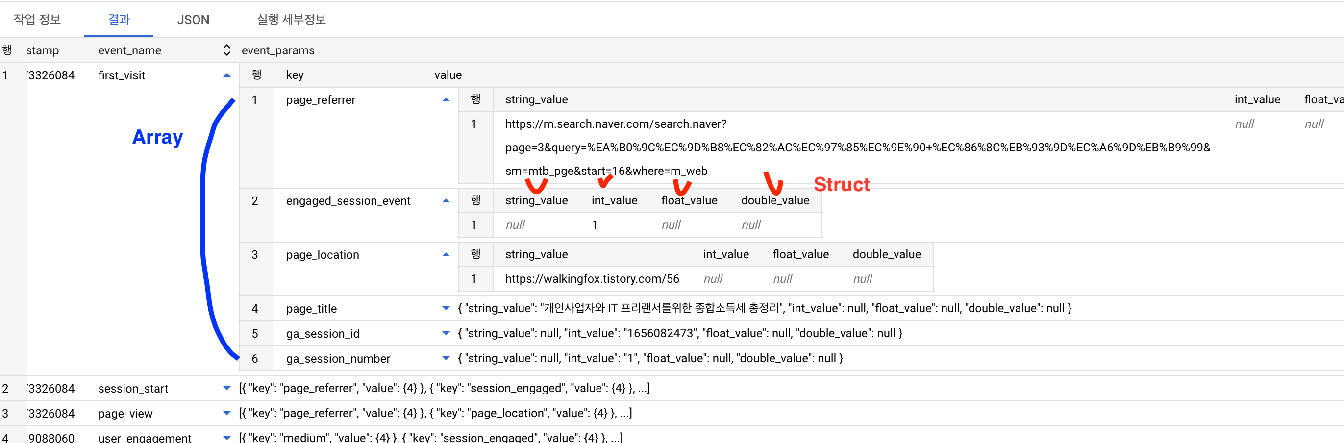 그리고 key는 array 형태이며, value 는 또 string_value, int_value, float_value, double_value 이렇게 4개 컬럼의 Struct 로 구성되어 있음을 알 수 있다.