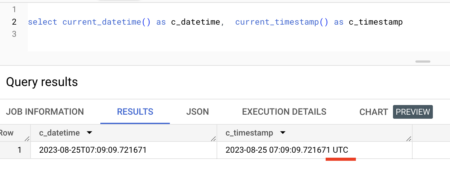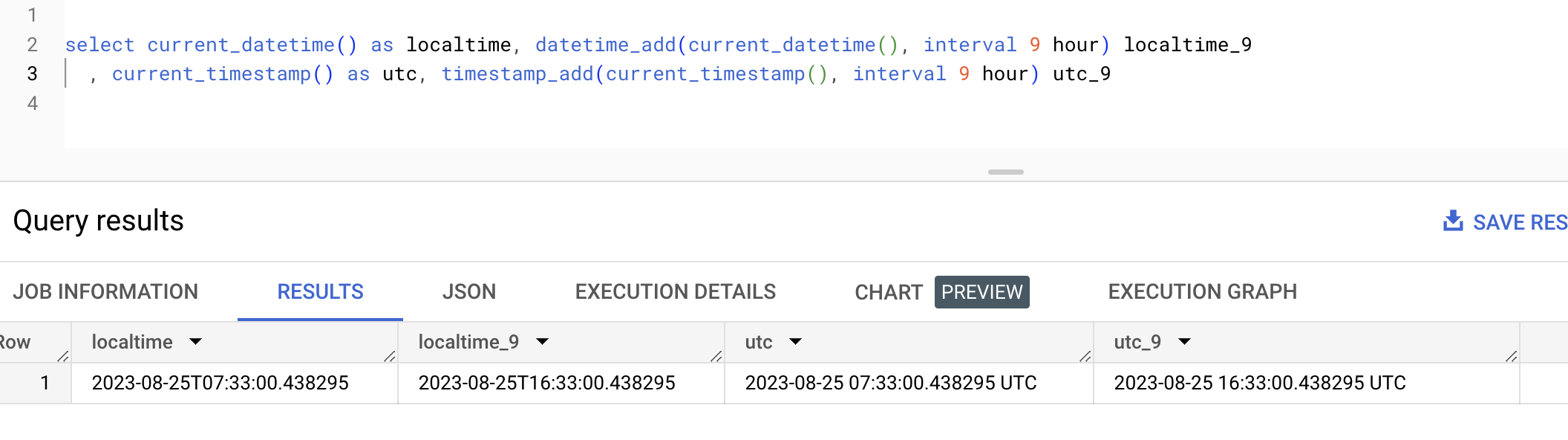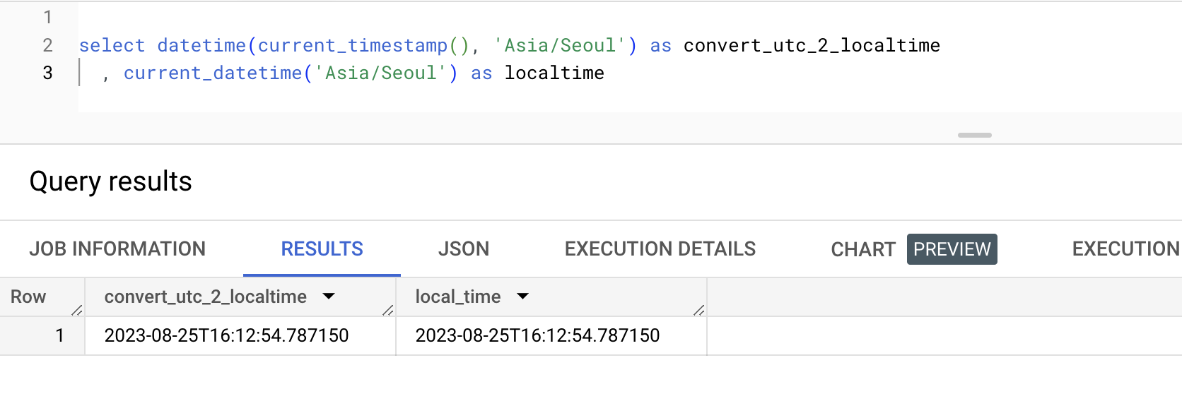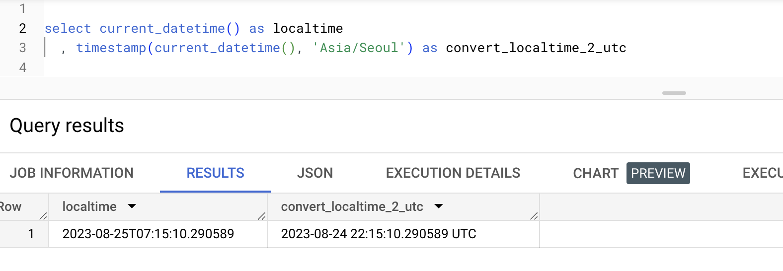 - 'Asia/Seoul'의 로컬시인 current_datetime() 을 표준시 (datetime)으로 변경한다는 의미이다. 그래서 결과도 -9 시간이 적용되었다.