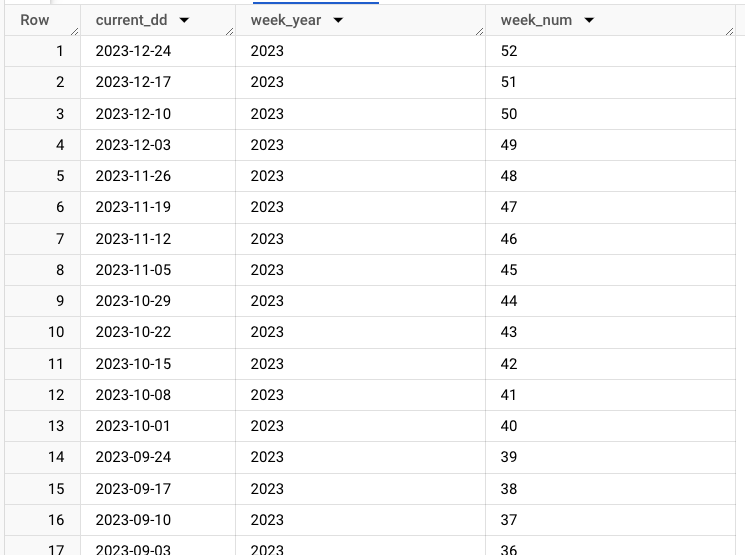 위 쿼리는 주어진 시작 날짜의 1년전 부터 종료 날짜 기간 사이의 주별 데이터를 출력한다.