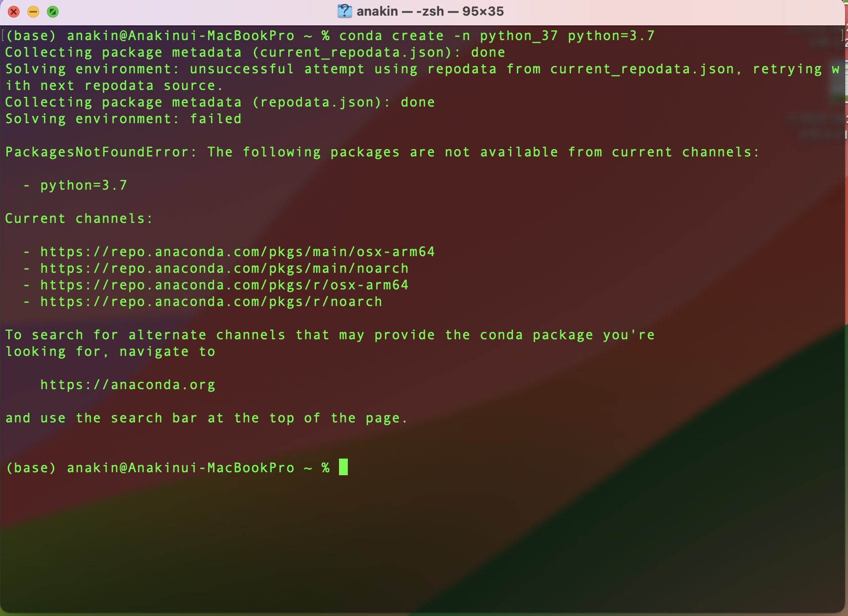 나의 경우는 M2 맥북 air 에서 anaconda 를 사용하는데, Python 3.7 버젼을 설치하려고 하면, 아래와 같은 에러가 뜨면서 가상 환경을 설치할 수 없다고 나온다.