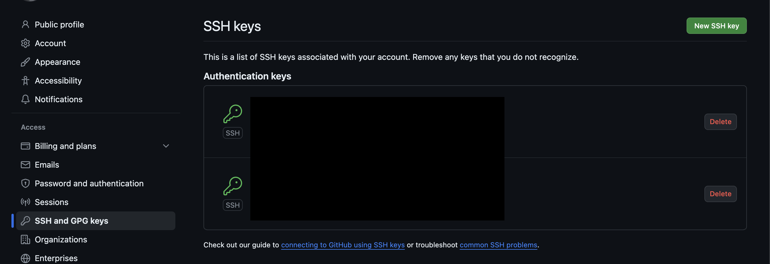 github 의 settings -> SSH and GPG keys 로 들어가면 위에 초록색 버튼 "New SSH Key" 버튼을 누른다.