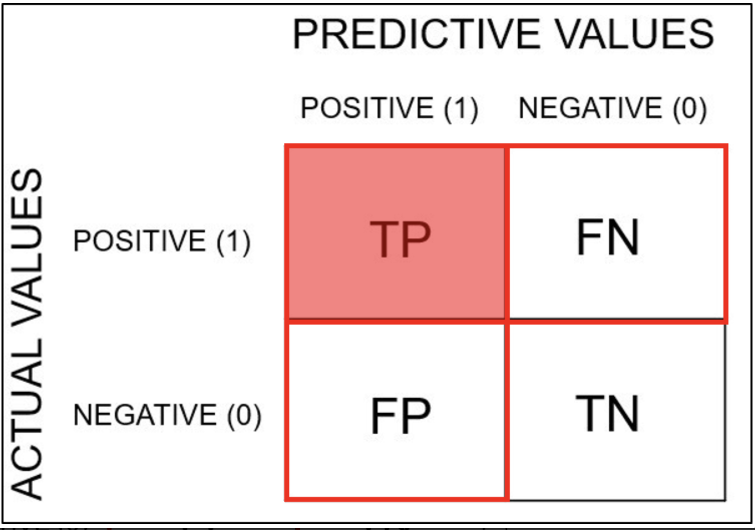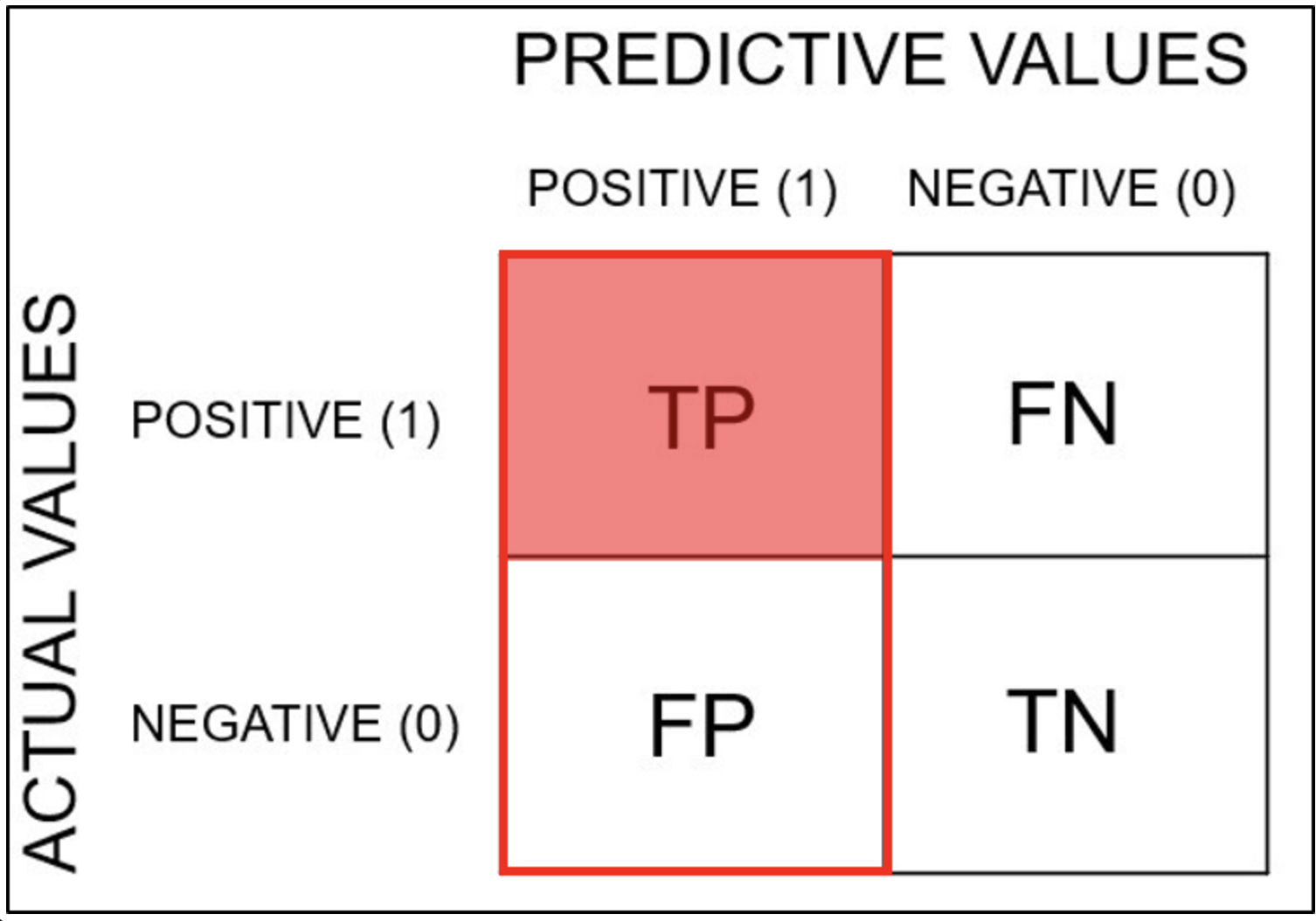 정밀도라고 하며, 양성이라고 예측한 부분 중 실제 양성인 부분에 대한 비율이다.