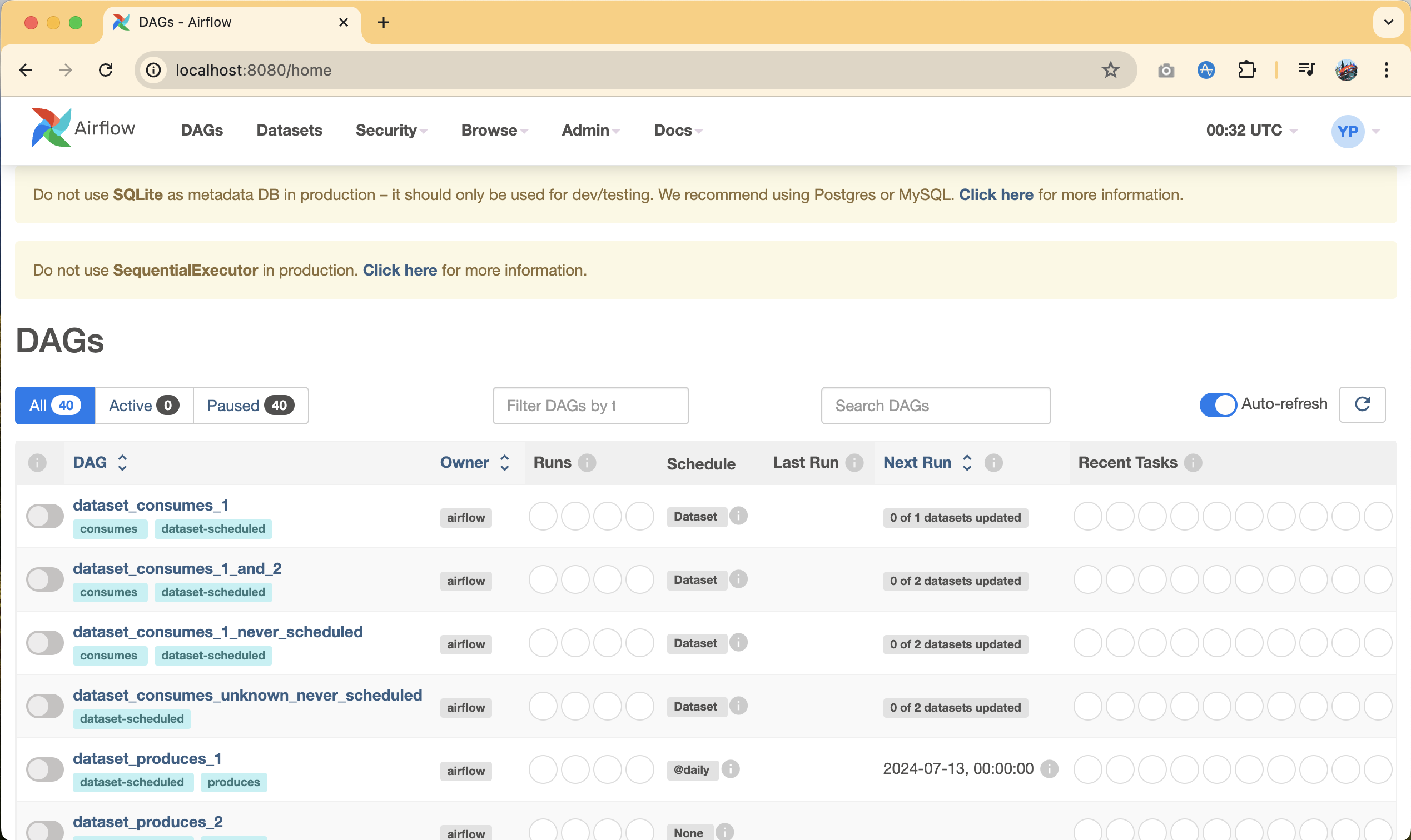 아래의 화면처럼 sample DAG들이 보인다면 성공적으로 설치가 되었다.