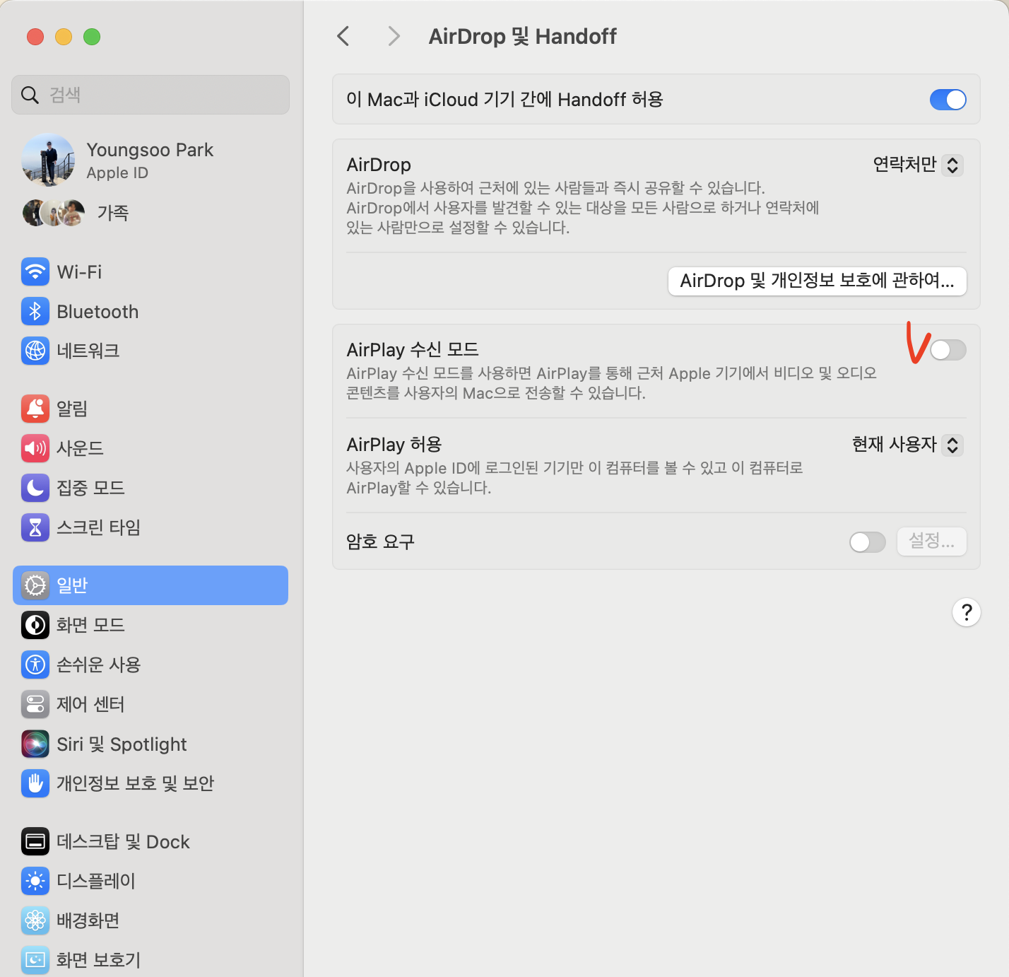 설정 -> 일반 -> AirDrop 및 Handoff -> AirPlay 수진모드 에 체크를 해지해준다.