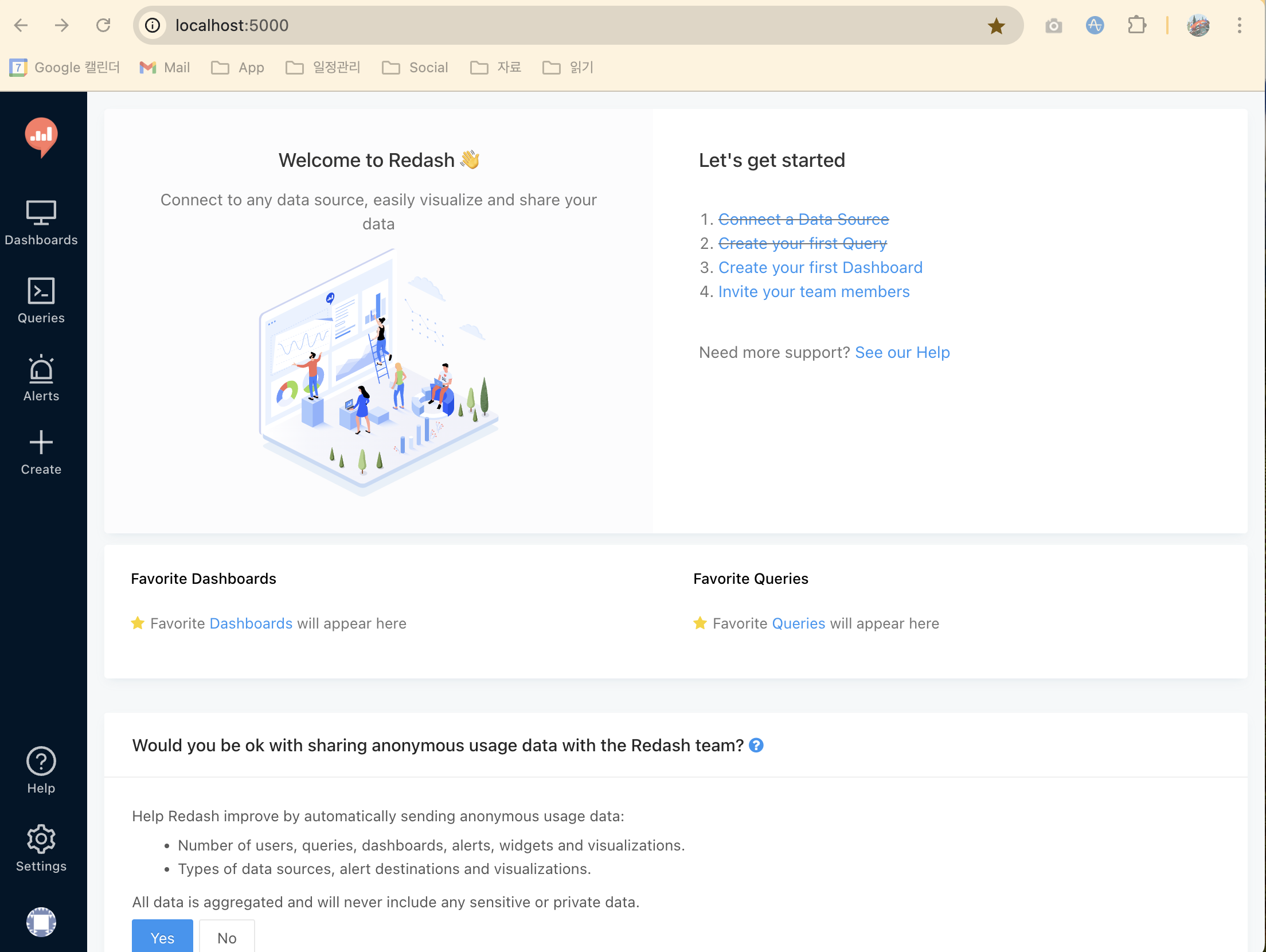 내 웹브라우져에서 http://localhost:5000 로 접속하면 redash 사용 준비 완료