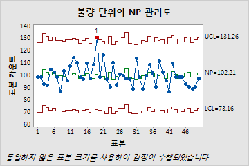 - NP 관리도에는 불량 단위의 전체 수가 Y축에 표시됩니다.